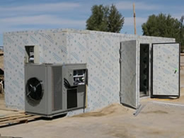 熱泵烘房,熱泵烘干房,空氣能烘房原理是利用逆卡諾循環(huán)原理,吸收環(huán)境中熱能,經(jīng)熱泵裝置提升到為高溫?zé)崮埽焕涿剑ǚ罚┩ㄟ^(guò)壓縮機(jī)做功,變成為高溫高壓氣體(溫度高達(dá)80-115℃),進(jìn)入室內(nèi)側(cè)的換熱器,利用風(fēng)機(jī)的排放熱量,升溫烘干房?jī)?nèi)空氣溫度。烘干房?jī)?nèi)的物料通過(guò)熱風(fēng)做功的形式使物料中的水分汽化蒸發(fā),蒸發(fā)出來(lái)的水蒸汽由排濕系統(tǒng)排走而達(dá)到烘干物料的目的。